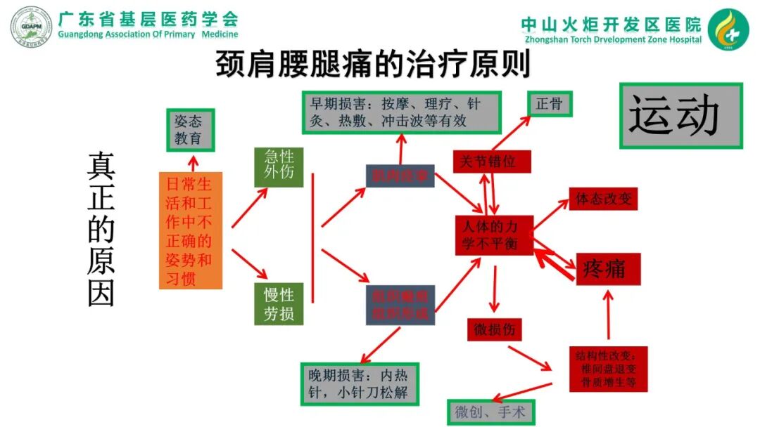 根据发病原因和机理的不同阶段采用不同的治疗方法。针对病因,纠正患者不正确的姿势,进行姿态的健康宣教;早期损伤的肌肉痉挛期,按摩、理疗、针灸、热敷、冲击波等都有效。晚期损害瘢痕组织形成后,瘢痕组织广泛的用内热针(银质针)效果好。局限条索状或结节状的用小针刀可解决问题。关节错位分急性的错位和慢性的错位。急性错位直接复位就可以了;慢性的错位肌筋膜的长度和力量发生了改变,单纯的复位疗效不持久,需要处理肌筋膜后再复位才能取得较持久的较果;结构性改变造成椎间盘突出,椎体骨质增生导致椎管狭窄,关节的骨性关节炎要骨科的椎间孔镜、关节镜等微创技术和脊柱开放手术和髋膝关节置换术才能解决问题;所有的病理阶段都需要运动。早期的肌肉痉挛通过运动疗法拉伸来解决,关节错位、体态的改变、疼痛、微创和手术后都可以通过运动来治疗和减少复发。运动疗法通过对力学不平衡的调节,可减慢人类脊柱和关节的退变速度,从而减少了手术的机会。