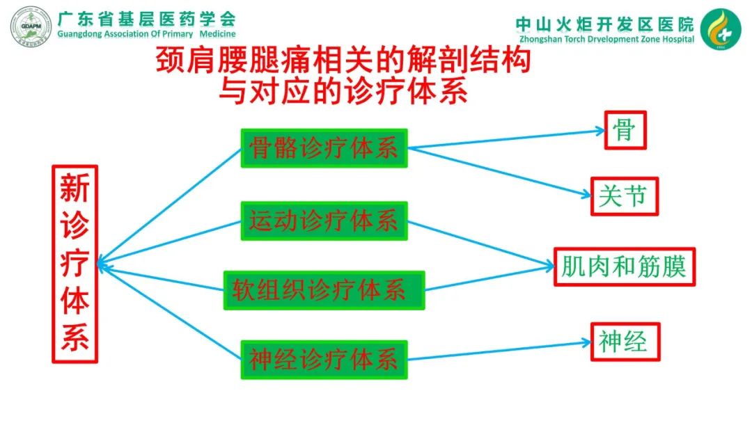 目前颈肩腰腿痛的诊疗体系有:西医神经诊疗体系、中医正骨诊疗体系、中西医结合软组织诊疗体系和运动诊疗体系四大诊疗体系。