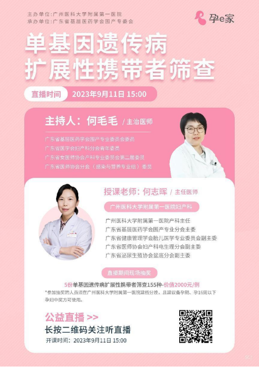 9月11日下午,由广州医科大学附属第一医院产科主办、广东省基层医药学会围产专业委员会协办的“单基因遗传病扩展性携带者筛查”线上直播课在广州顺利举行,近三百多名人员参与。